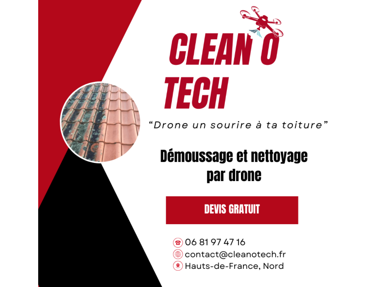 Clean’O Tech est une société innovante spécialisée dans le nettoyage et le démoussage de toitures par drone, basée à Seclin et intervenant dans tout le Nord et plus largement dans les Hauts-de-France. Grâce à l’utilisation de drones professionnels équipés pour le traitement des toitures, l’entreprise propose une solution rapide, sécurisée et respectueuse des structures, sans recourir aux échafaudages ou nacelles traditionnelles. Le recours à cette technologie permet non seulement de gagner du temps sur les chantiers, mais aussi de réduire les risques liés aux interventions en hauteur. Clean’O Tech met son expertise au service des particuliers, des syndics de copropriétés, des entreprises et des collectivités afin d’offrir des prestations fiables et efficaces adaptées à tous types de toitures.