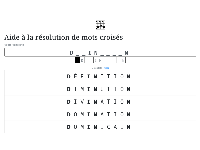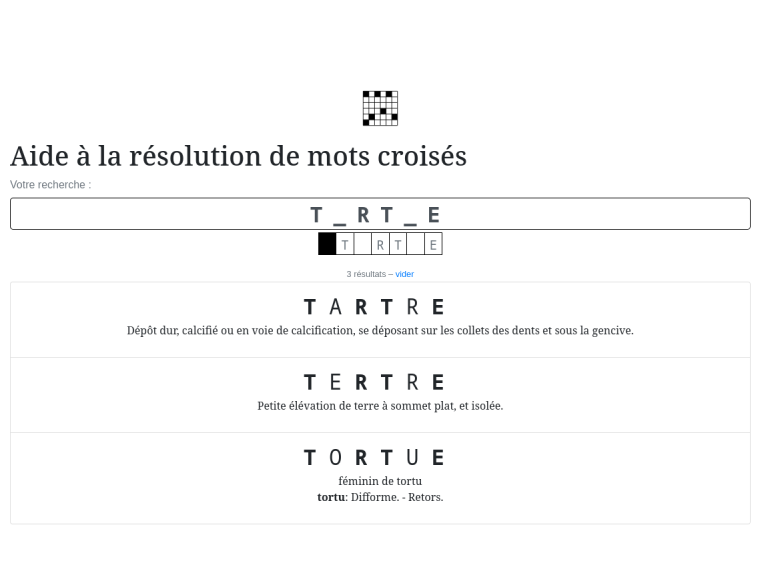 Cruciverbe.fr est un moteur de recherche conçu spécifiquement pour aider les amateurs de mots croisés et de mots fléchés à avancer dans leurs grilles. Son fonctionnement est simple et intuitif : vous saisissez les lettres que vous connaissez déjà dans un mot, et vous utilisez le caractère « _ » pour représenter chaque lettre inconnue. Par exemple, pour un mot de six lettres dont vous connaissez la première et la quatrième lettre, vous entrez quelque chose comme « T__T__ ». Cruciverbe vous retourne instantanément la liste complète des mots français correspondant exactement à ce patron. Le dictionnaire utilisé est soigneusement filtré : vous obtenez des réponses réellement utiles, sans bruit.
