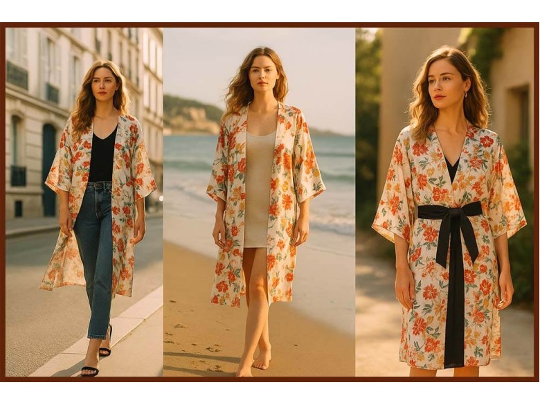 Des modèles fluides, légers et raffinés, parfaits pour la détente, la ville ou la plage. Du kimono long au kimono court, chaque création épouse les mouvements avec grâce et simplicité.